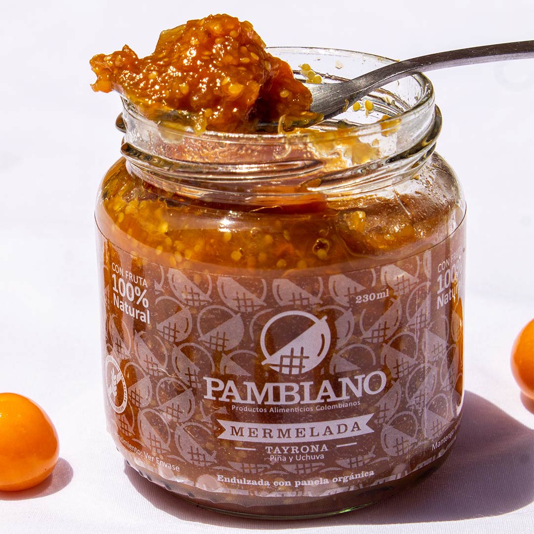 Hecha con piña y uchuva 100% natural, nuestra mermelada Tayrona captura la esencia del Caribe colombiano con un sabor exótico, balanceado y refrescante. Está endulzada exclusivamente con stevia líquida natural, lo que la convierte en una alternativa saludable a las mermeladas convencionales. Libre de azúcar añadida, sin conservantes, sin colorantes ni químicos. Ideal para untar, combinar con quesos suaves o acompañar platos dulces y salados con un toque tropical y natural.